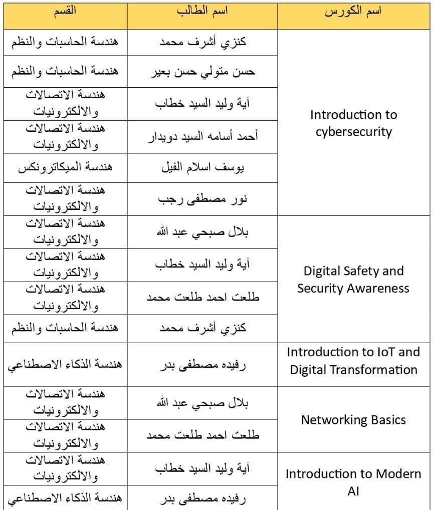 يتقدم السيد الأستاذ الدكتور حاتم خاطر – عميد كلية الهندسة – بخالص التهنئة لأبنائه الطلاب من مختلف الأقسام بالكلية، وذلك لتفوقهم وتميزهم في اجتياز عدد من الكورسات المقدمة من أكاديمية سيسكو Cisco Academy بالتعاون مع كلية الهندسة، متمنين لهم دوام النجاح والتفوق.