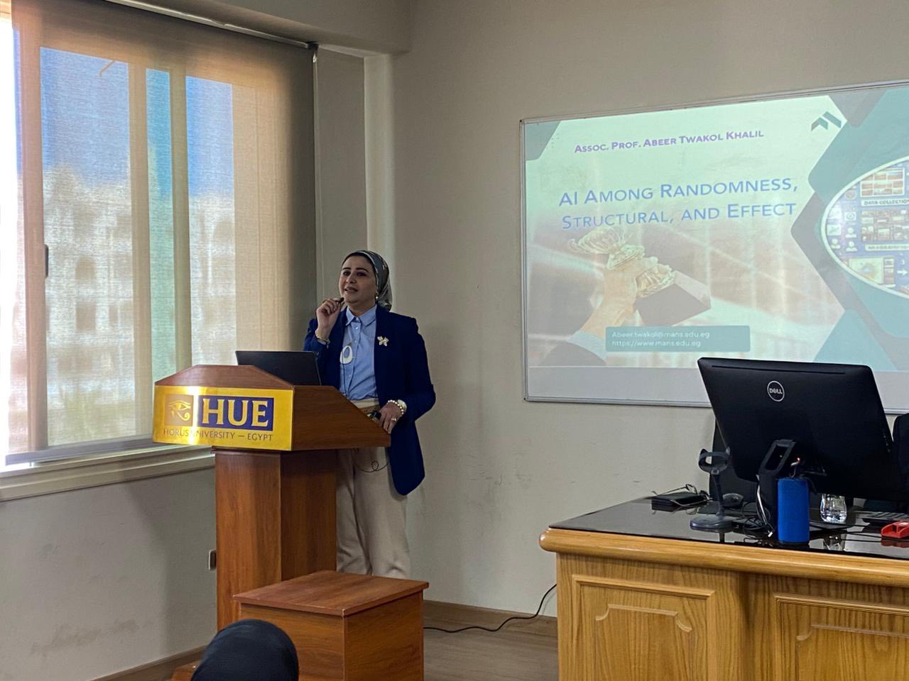 كما ألقت السيدة الأستاذ الدكتور عبير توكل رئيس قسم هندسة الذكاء الاصطناعي بكلية الهندسة – جامعة المنصورة ومدير مركز الإبداع والتطوير، محاضرة شيقة حول تطبيقات الذكاء الاصطناعي والخوارزميات الشهيرة، وقد لاقت اهتماماً كبيراً من الحاضرين، حيث نقلت خبراتها الواسعة إلى طلبة القسم بجامعة حورس. واختُتمت الفعاليات بتكريم: